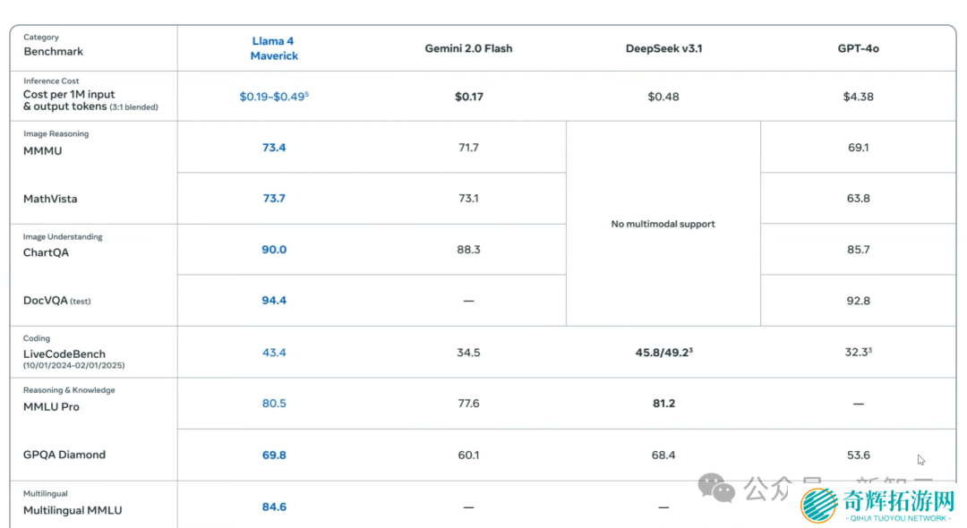 如果从消极的角度下判断,就可以说 Llama 4 最大的模型参数上 DeepSeek V3 基础模型的许多倍,性能却基本处于同一水平。
