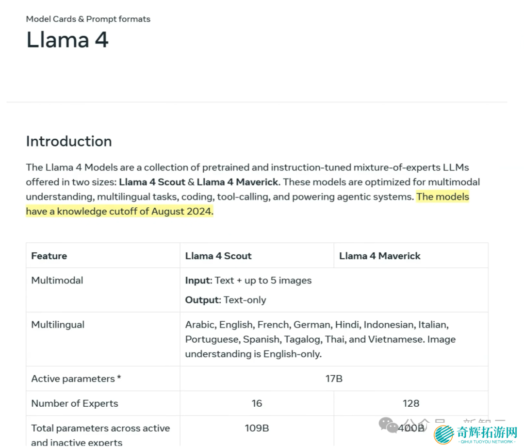 此外,Llama 4 的最新训练数据截止时间是 2024 年 8 月,这就很奇怪。