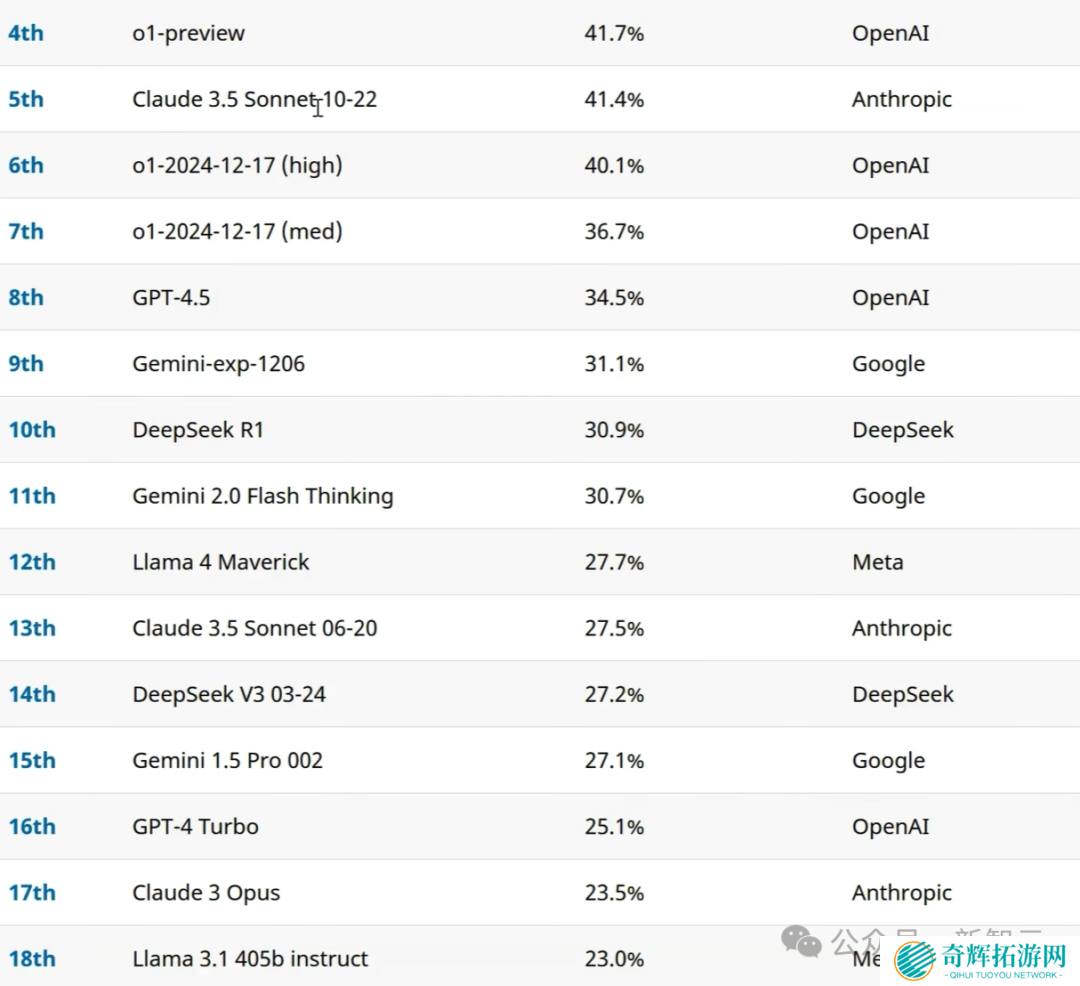 还有在 Simple Bench 中,Llama 4 Maverick 的得分大概为 27.7%,跟 DeepSeek V3 处于同一水平,还低于 Claude 3.5 Sonnet 这类非思维模型。