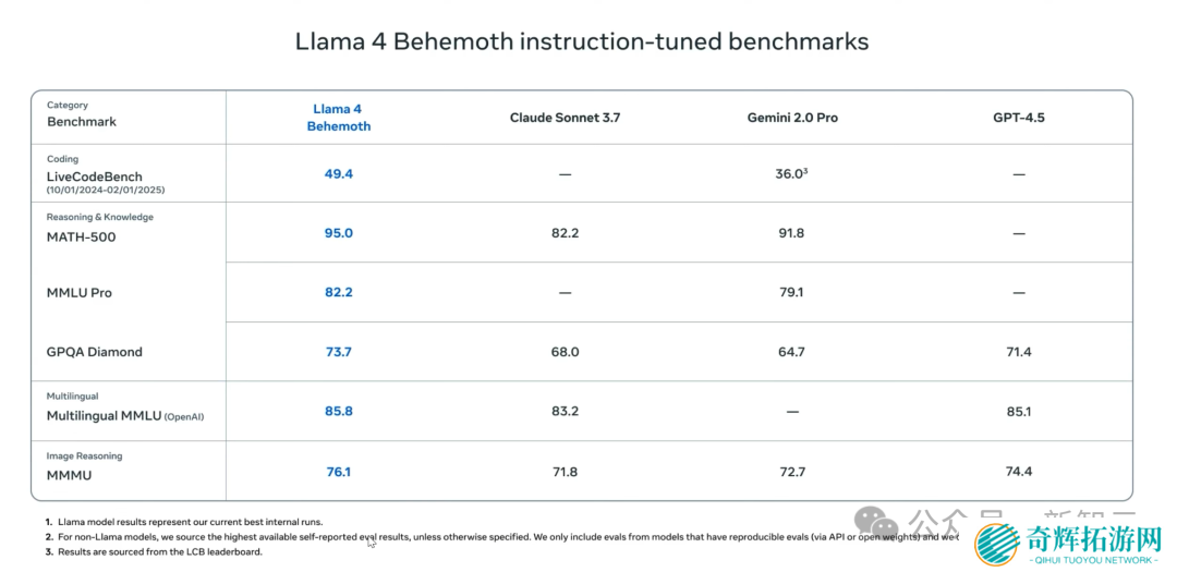 在下面这个表格中,Meta 将 Llama 4 和 Gemini2.0 Pro、GPT-4.5 等模型进行了比较,数字非常漂亮。