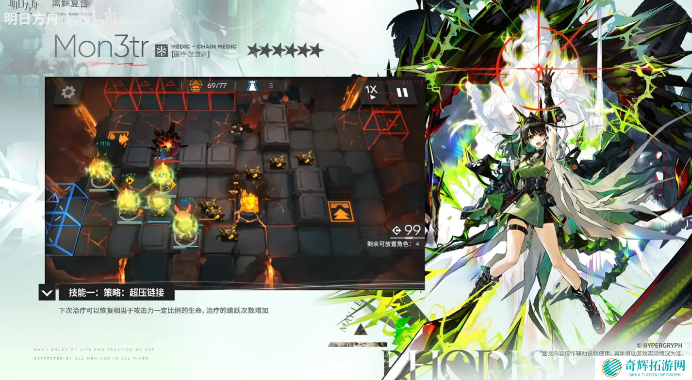 随着新主线「离解复合」的更新,不知道各位博士们有没有抽到Mon3tr?新主线剧情很让人期待,接下来小编就来一起分析一下这位链愈师的强度,看看她能在未来的作战中给我们带来怎样的表现。