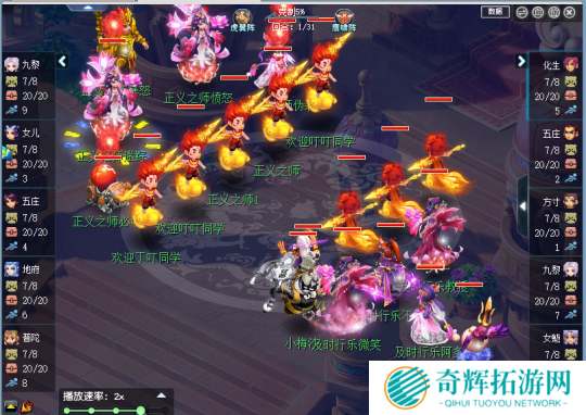 正义之师拉起九黎给其驱魔解除了囚笼,及时行乐则给己方九黎加上天地同寿保证输出,同时利用速度优势轮流封印正义之师的人物单位,围点打援,让正义之师九黎一直保持被封杀的状态。正义之师仅有九黎一个输出,无法动弹也就让及时行乐双幻魔成型,女魃墓也加入了进攻行列,正义之师女儿五庄血量非常危险。