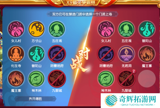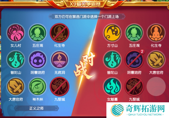 天启组决赛由正义之师对战及时行乐,禁选方面,正义之师被禁化生九黎,及时行乐被禁地府九黎。双方可以选择阵容并不少。