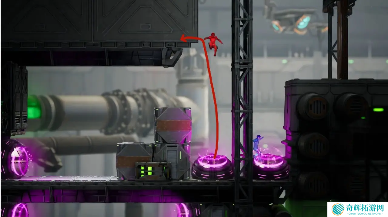 在遭遇第一个紫色传送圈时,观察四周,你可以向上跳跃进入隐藏区域,抵达目的地即可获得成就。