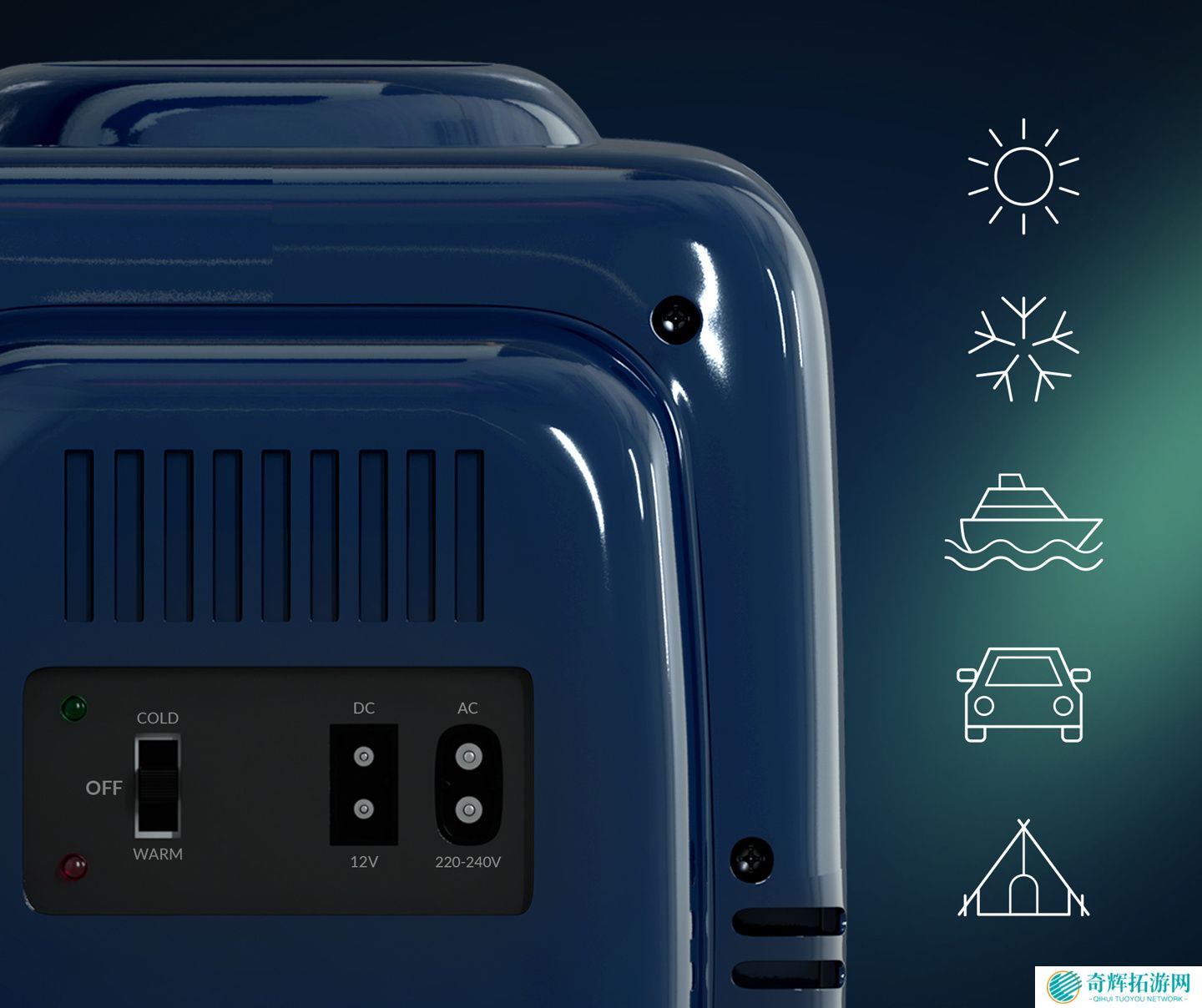 这款小型桌面冷热冰箱支持 AC 交流和 12V DC 直流两种供电方式,无论是在室内中还是在旅途上都能方便使用。