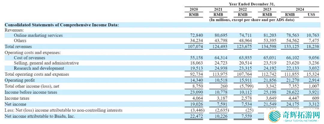年报显示,百度 2020 年、2021 年、2022 年、2023 年、2024 年营收分别为 1070.74 亿元、1244.93 亿元、1236.75 亿元、1345.98 亿元、1331.25 亿元。
