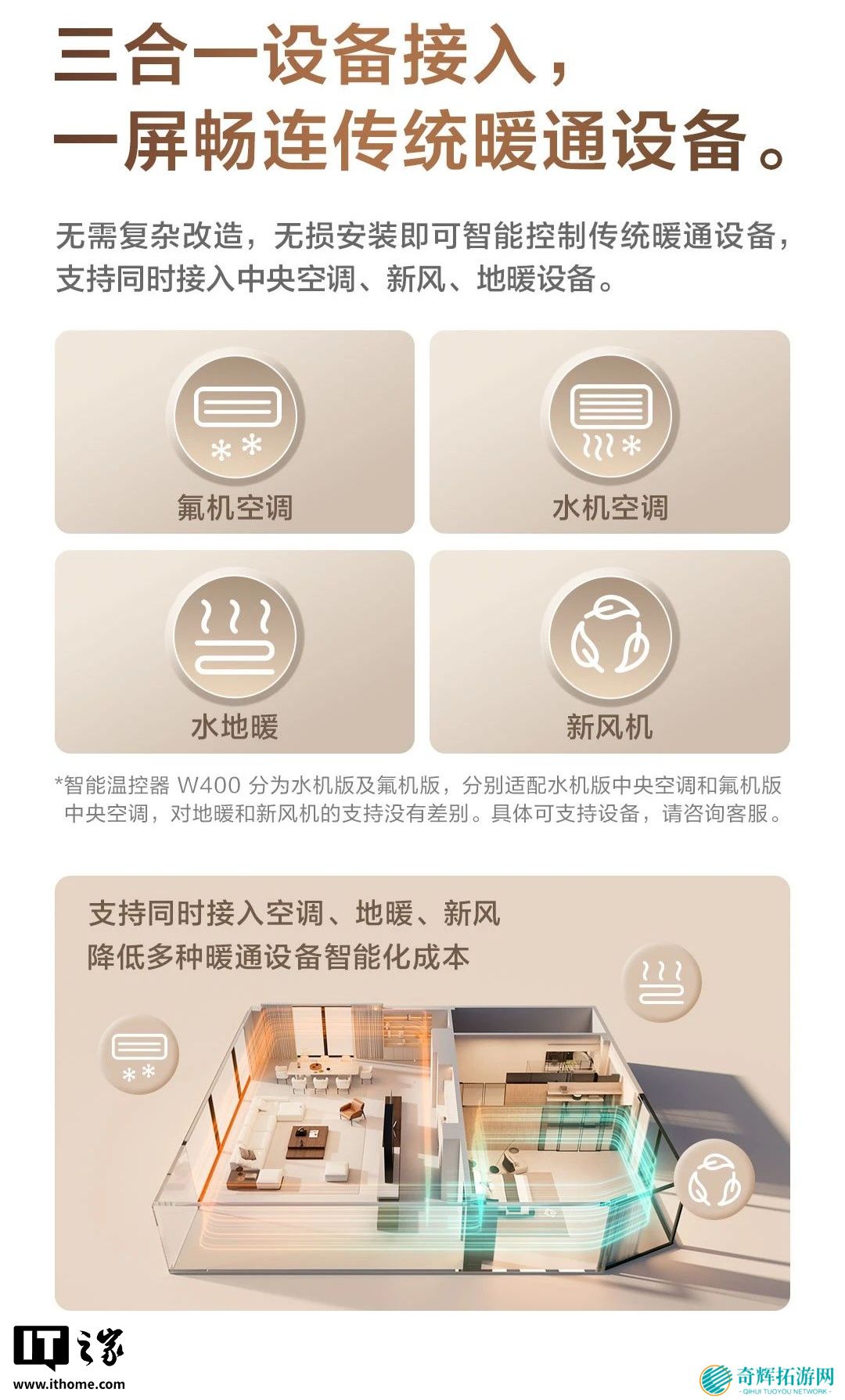 京东绿米 Aqara 智能温控器 W400 三合一设备接入 | 双协议支持 1299 元直达链接据介绍,绿米 Aqara 智能温控器 W400无需复杂改造,支持无损安装,可智能控制传统暖通设备,支持同时接入中央空调、新风、地暖设备。