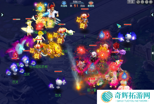 48回合,封狼战队给对手盘丝落花成泥并换出一只高速谛听,但是却被对手烟雨剑法+瞬法须弥巧妙秒死,化解了攻势。同时猪圈战队禁疗了封狼花果山,反手拉出瞬法蓝光须弥冲刺,打算一波冲掉,但是被封狼巧妙抗住。