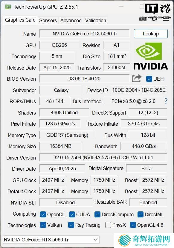 在架构方面,RTX 5060 Ti采用了全新的Blackwell架构、第五代Tensor核心和第四代RT核心,支持DLSS 4多帧生成技术。显存规格从上一代的8GB GDDR6升级到了16GB GDDR7,无论是容量还是工艺都有显著提升。具体规格上,该显卡拥有4608个CUDA核心,核心频率工作范围为2407MHz–2572MHz,显存位宽为192-bit,总带宽达到448GB/s,TDP为180W。