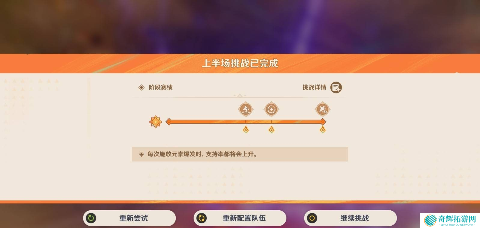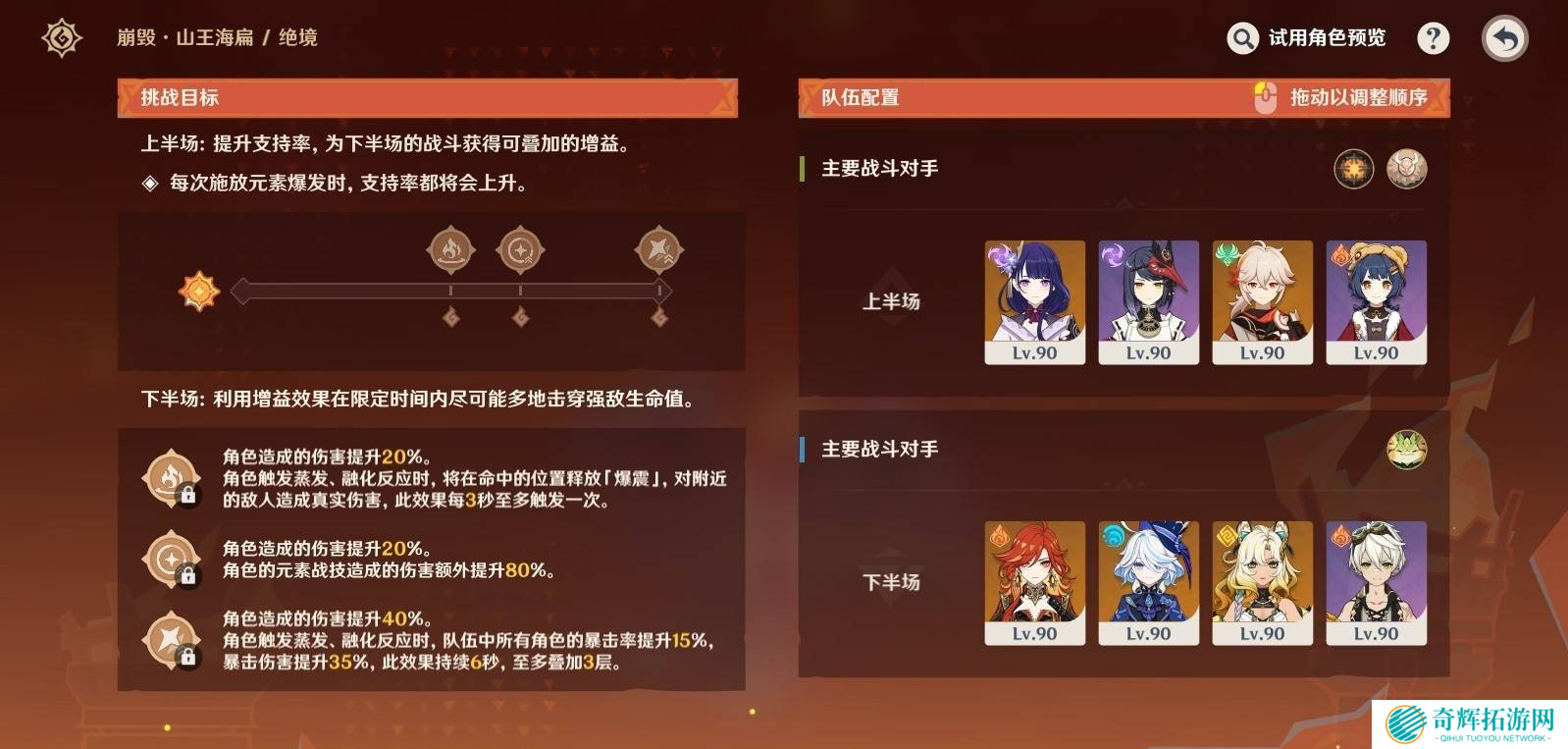 上半场机制:每次释放元素爆发都会提升“支持率”,上半打得好,下半战斗全员吃Buff!