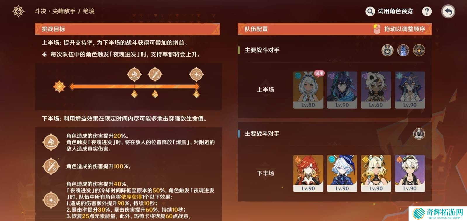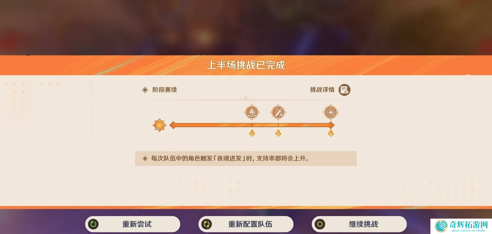 注意:下半场可以在继承上半场支持率的基础上重新挑战,无需再次打上半场。挑战失败后,可以在队伍配置界面直接更换阵容。如果想重新挑战上半场,点击界面下方的“重置挑战进度”即可。