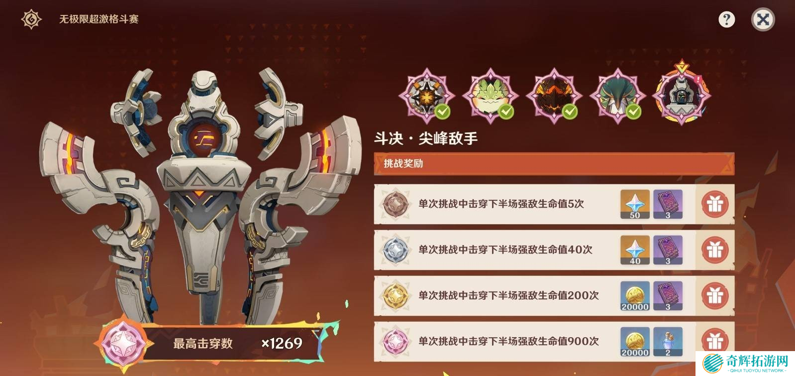 单次挑战中击穿下半场敌人的生命值5/40/200/900次。
