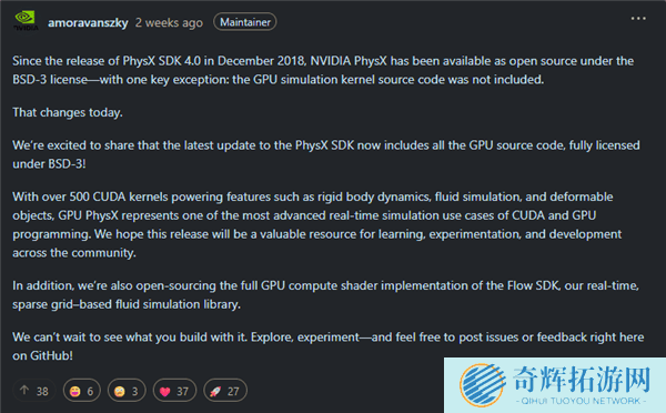 回溯至2018年末,NVIDIA曾公开了PhysX SDK 4.0的开发包,并依据BSD-3许可协议释放了部分源代码,但最为关键的GPU模拟内核却并未包含在内。这一举措虽然为开发者们打开了一扇窗,但仍有局限。