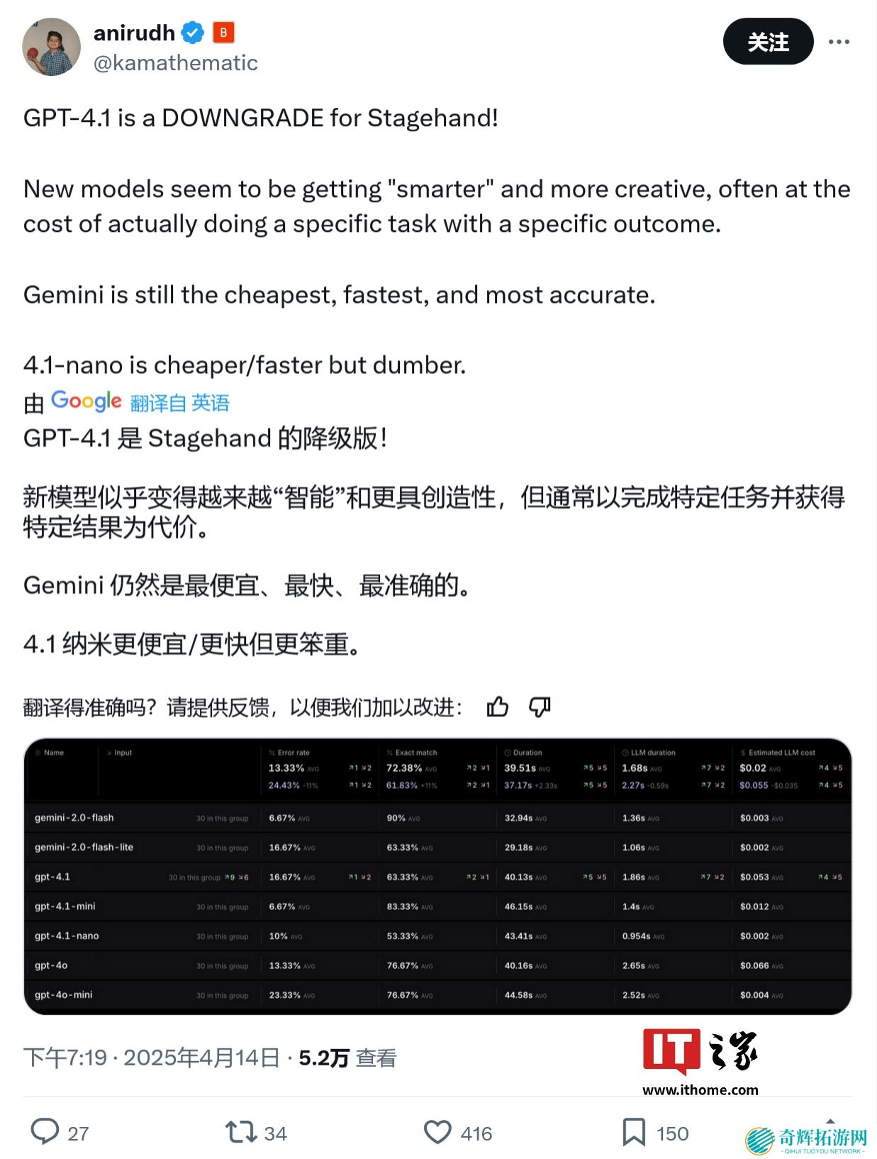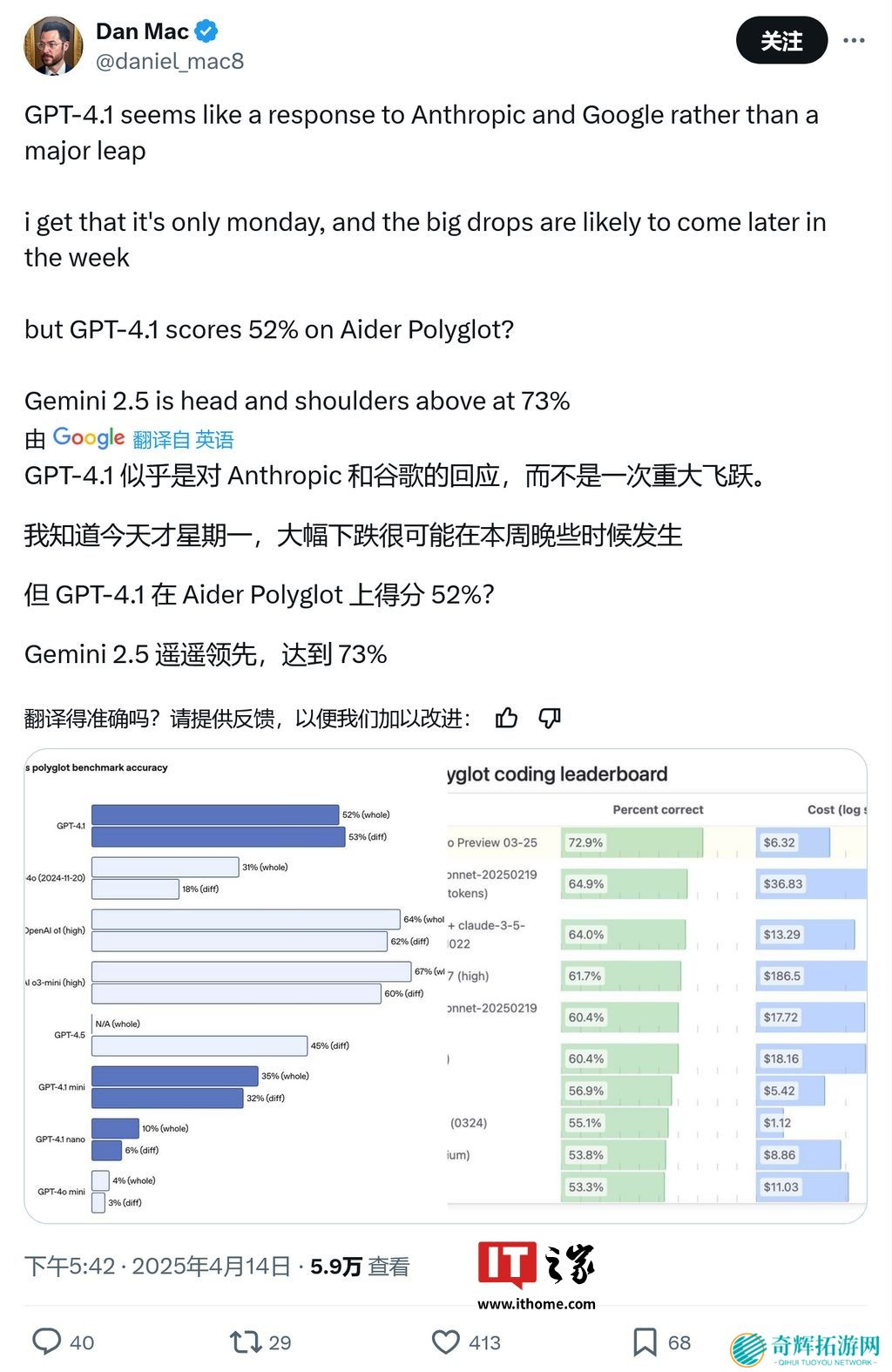 本站 4 月 16 日消息,科技媒体 bleepingcomputer 昨日(4 月 15 日)发布博文,报道称 OpenAI 最新发布的 GPT-4.1 系列模型,其性能相比 GPT-4o 虽然实现重大飞跃,但多项跑分未能超越谷歌的 Gemini 系列。
