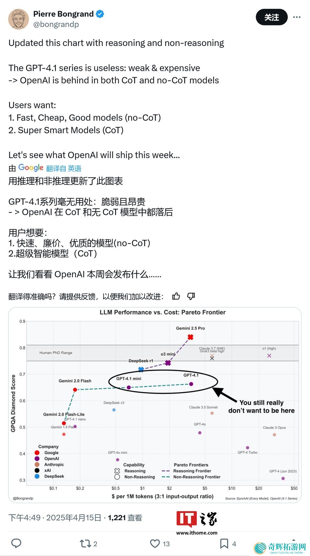此外,哈佛大学 RNA 科学家 Pierre Bongrand 提供的数据也指出,GPT-4.1 的性价比不及 Gemini 2.0 Flash、Gemini 2.5 Pro 及 DeepSeek 等竞品。