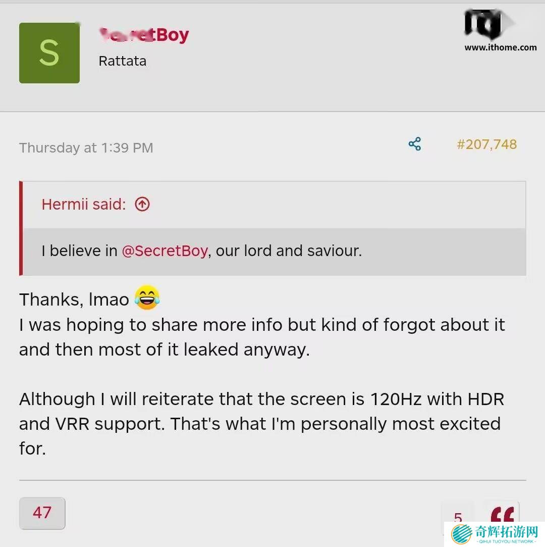 随着讨论的深入,SecretBoy在随后的帖子中重申了屏幕规格,即120Hz刷新率、HDR以及VRR功能的LCD屏幕。尽管他表示对最终显示素质尚不确定,但推测任天堂选择LCD而非OLED屏幕可能是出于成本控制的考虑,并确保开发者能在首发硬件上实现统一优化。