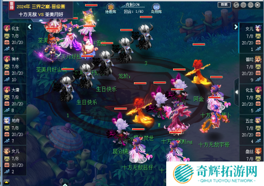 三届之巅天元组第二轮十方无敌鸟阵五辅助大克了荃美月好的地阵国标,十方无敌拿到了全场1、3、4、5速,利用速度优势控制住了荃美月好的人物单位,并给其挂上紧箍咒和毒,仅仅第六回合,十方无敌盘丝就已经开始姐妹同心烧荃美月好地府的魔法。