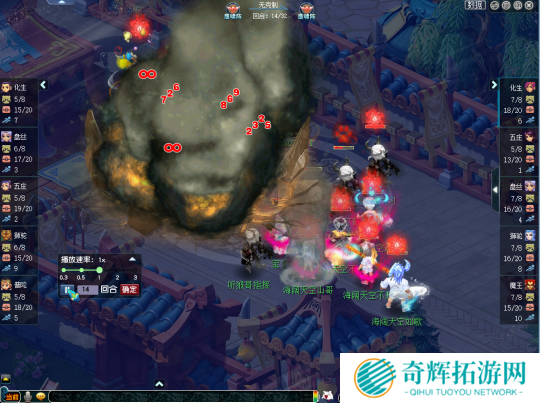 海阔天空使用五庄盘丝双封阵容,笑里猴则使出最拿手的四保一阵容,只不过这次保的是狮驼,双方均使用鹰阵无阵法克制。
