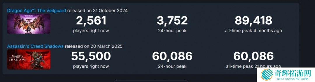 《刺客信条:影》Steam在线峰值仅6万人左右,不及《龙腾世纪:影障守护者》,后者Steam同时在线峰值接近9万人,但EA仍将《龙腾世纪:影障守护者》视为重大失败。