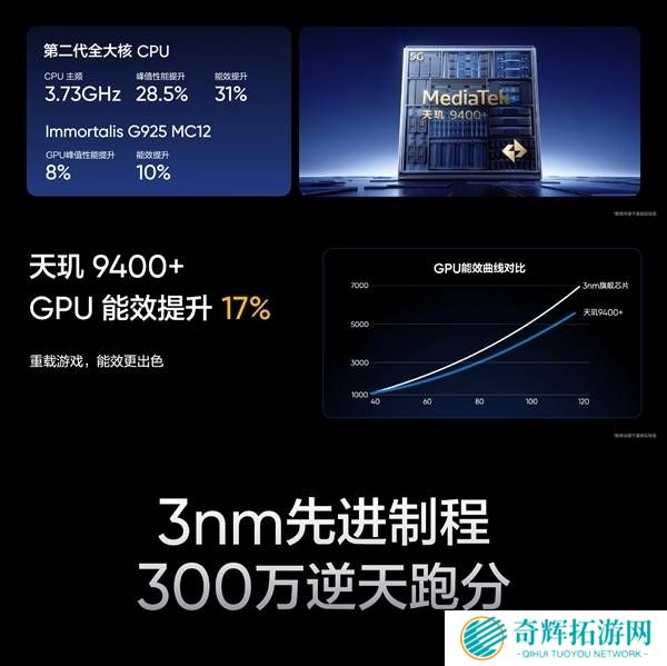 在核心性能方面,真我GT7搭载了天玑9400+处理器,GPU能效提升显著,高达17%,跑分轻松跨越300万分大关。该机型还支持1.5K+144Hz的超分超帧并发技术,并首发GT性能引擎2.0与芯片级内核技术,确保满电到关机过程中的游戏帧率稳定,如《原神》等大型游戏实测中,帧率表现如直线般平稳。