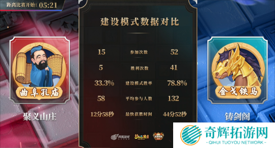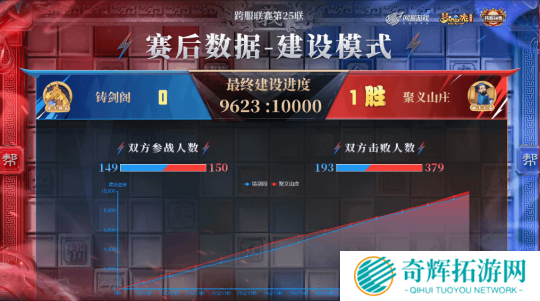 最终,【聚义山庄】以 377 点建设进度差距和 186 个总击败人数差距击败【铸剑阁】,以 1:0 的比分暂时领先。从赛后数据来看,【铸剑阁】能在击败和建设双双落后的情况下,在比赛中后期缩短与【聚义山庄】的差距,足以证明他们的整体实力和顽强韧性!