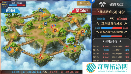 随着建设差距不断拉大,【铸剑阁】开始采用 “拆队” 战术来提升伐木速度,逐渐追平了建设差距。但这样做的代价是被【聚义山庄】拉开击败差距,导致场内人数明显下滑,建设进度也愈发缓慢。