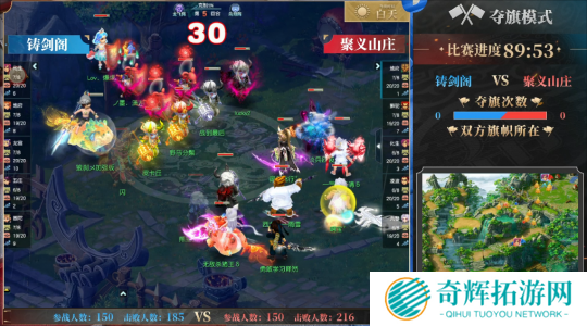 比赛开始后,【铸剑阁】依靠高强度的 “保核心” 队伍锁住【聚义山庄】的三攻队伍,并逐渐拉开击败差距。不过,这个差距相当微弱,比赛进行到第 30 分钟时,【铸剑阁】也只比【聚义山庄】多出 5 个击败人数。