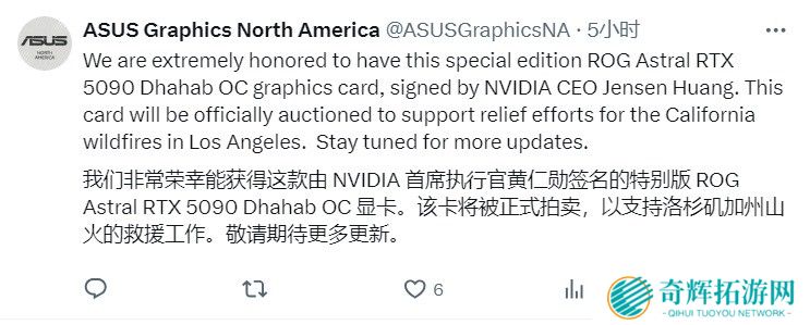 华硕表示:“我们非常荣幸能获得这款由NVIDIA CEO黄仁勋签名的特别版ROG Astral RTX 5090 Dhahab OC显卡。这张卡将被正式拍卖,以支持洛杉矶加州野火的救援工作。”