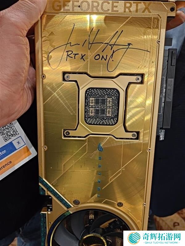 3月21日消息,在2025年GTC大会上,华硕北美分部市场总监Ernest Cheng分享了一款极为奢华且独一无二的显卡——黄仁勋亲笔签名的ROG RTX 5090 Astral Dhahab OC。