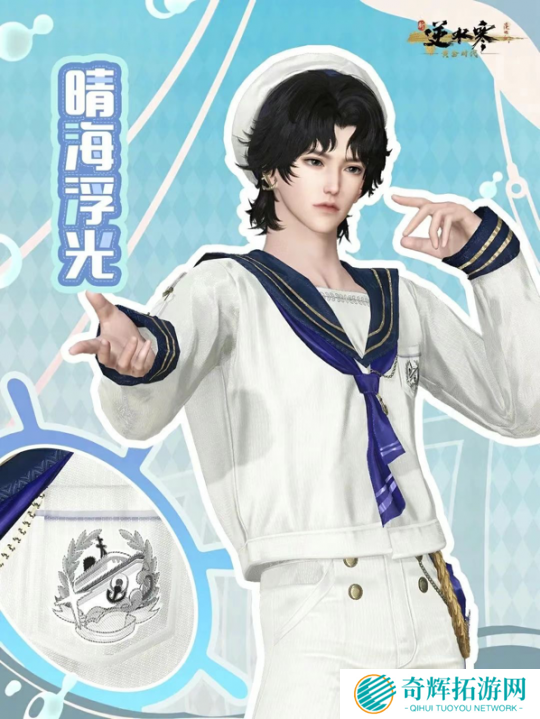 而水手领结、船锚形状的金属饰品,混搭上白色贝雷帽,不仅完美展现了春日时尚单品的清新,还兼具了酷飒感,凸显角色的少年感。青春气息如此浓郁的水手制服,也难怪玩家疯狂点赞,忍不住夸夸官方:有这样帅气的男款时装进入大宋,《逆水寒》美术制作组你做什么都会成功的。