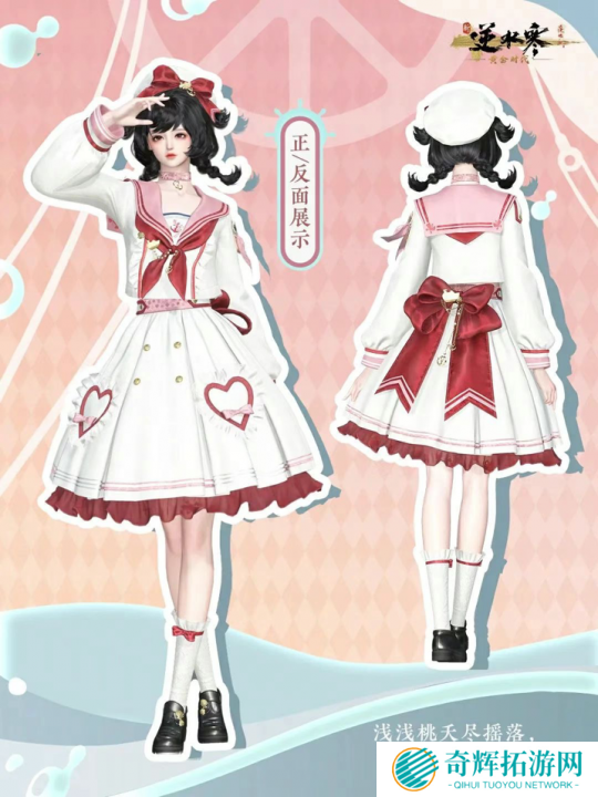 女款【桃心浅浅】,一身标准的天然呆少女造型,灵动气质让人印象深刻。羊角辫发型配上粉白色系的JK蓬松小短裙,萌妹子的既视感这不就来了。还有点缀在裙摆的可爱蝴蝶结和粉色桃心图案,少女心十足。