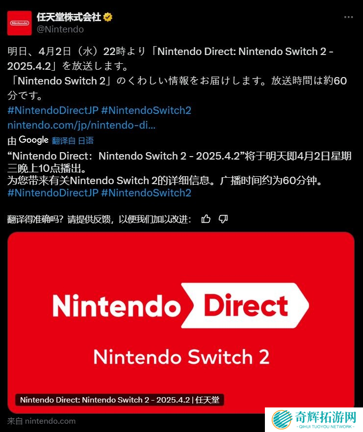 任天堂官方最新消息!备受期待的Nintendo Switch 2直面会将于北京时间4月2日晚上9点 正式开播,并且本次直播时长约60分钟!这也意味着,大家可能会迎来大量关于NS2的全新信息!