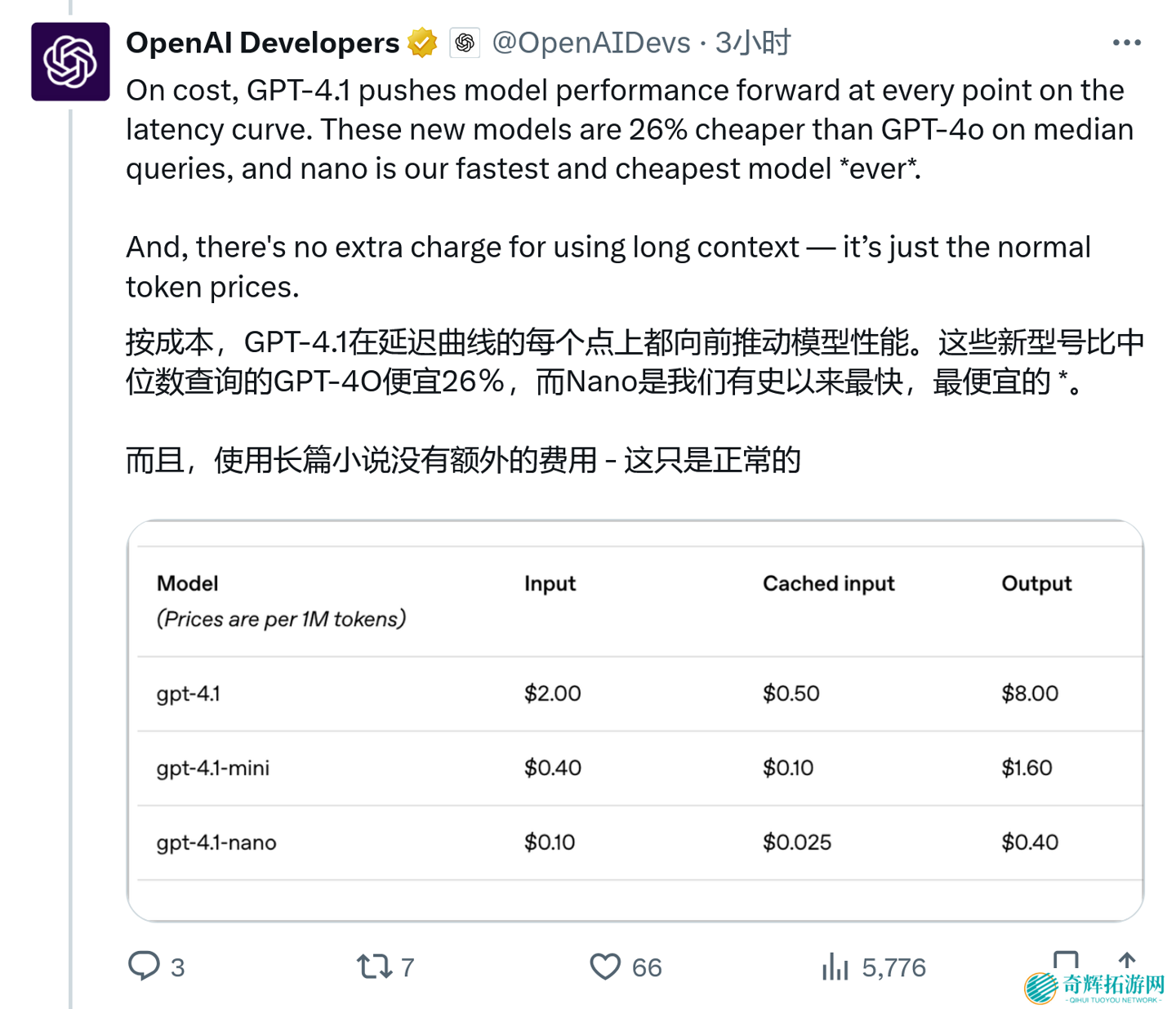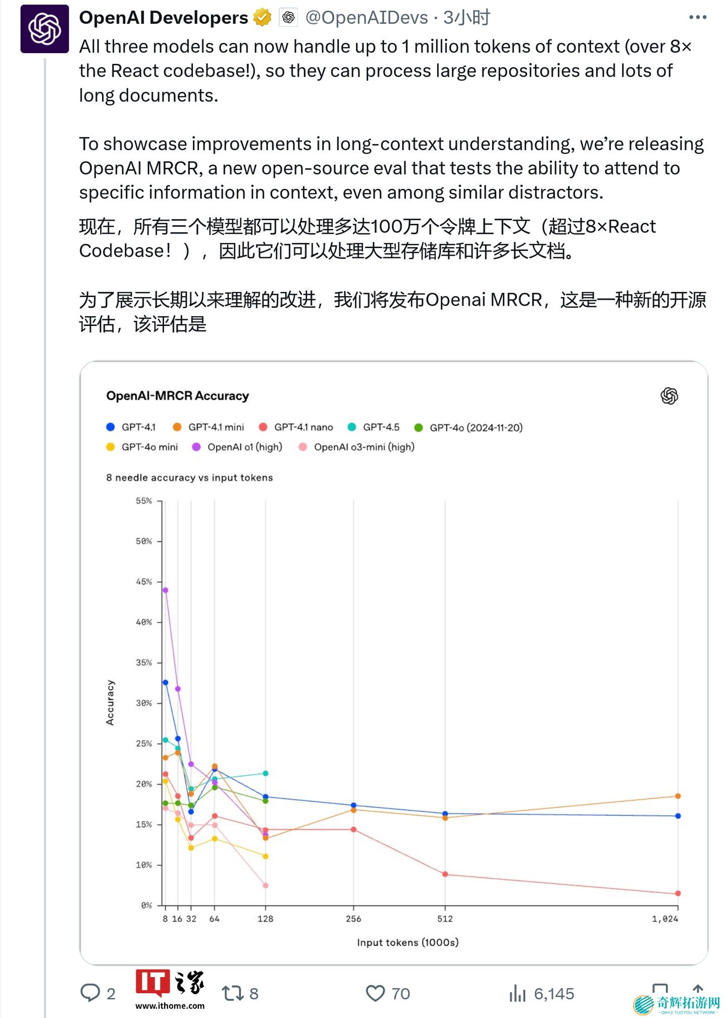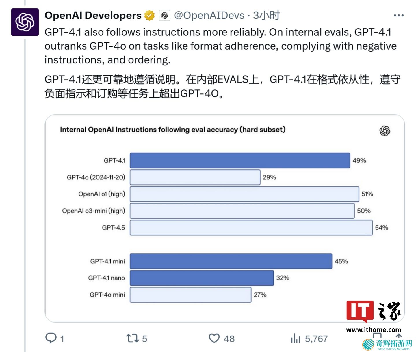 OpenAI 在官方博文中表示,GPT-4.1 系列模型在编程、指令遵循和长文本处理上表现优异,全面超越 GPT-4o 及 GPT-4o mini。