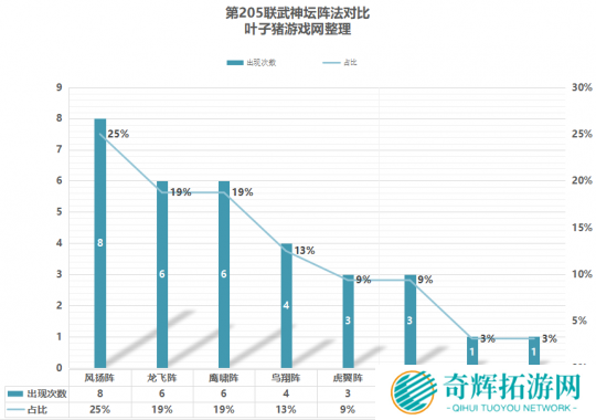 第205联武神坛出战阵法中出现最多的是风扬阵,其次为龙飞阵、鹰啸阵、鸟翔阵、虎翼阵,这样的阵法情况主要是与“大唐官府、神木林”为主的“国标阵容”有关。不过,部分服务器为了追求阵法克制,会选择使用风扬阵来对抗鹰啸阵,取得了相当不错的效果。