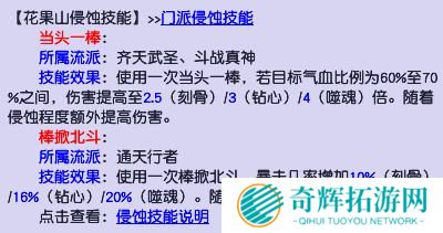 除此之外,满级侵蚀技能可以将花果山当头一棒的伤害扩充到4倍,这就意味着当对手陷入危险血线时,花果山就可以靠着侵蚀技能的伤害完成斩杀。这样的伤害加成搭配无所遁形、金刚护法、诸天看护、满天花雨等伤害BUFF后,即便是“四保一”、“五保零”等硬核抗性也难以抵挡。而纵观当今武神坛,大家的抗性主要偏向于法防,因此花果山的表现更为值得期待!