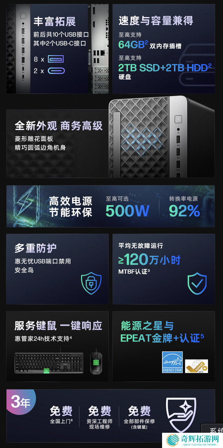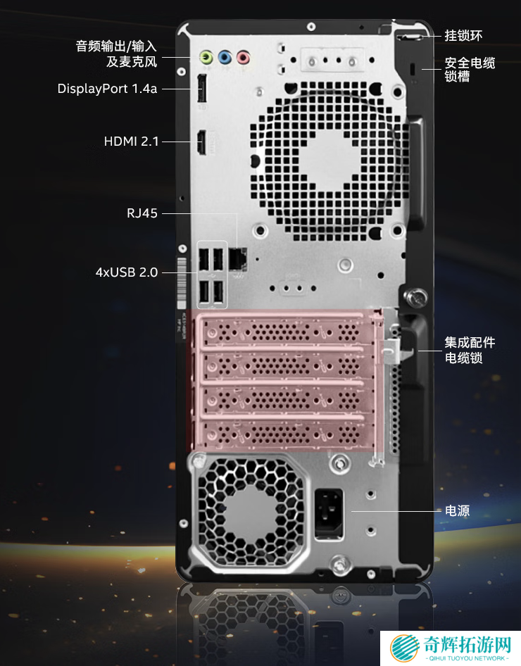 这款台式机支持 Wi-Fi 6和蓝牙 5.4 技术,I/O方面本站获悉该机正面配备4个 USB-A 5Gbps接口;1个 USB-C 5 Gbps接口、1个 USB-C 10 GBps接口;背面配备1个 DP 1.4a接口、1个 HDMI 2.1接口、1个 RJ45网口、4个 USB-A 2.0接口、音频接口。