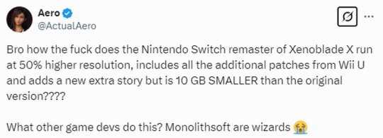 近日玩家Aero发推文称,《异度神剑X:终极版》容量大小为13.5GB。而WiiU原版容量大小为23GB。为什么终极版分辨率提高了50%,包含了WiiU原版所有附加内容,并增加了一个新的额外剧情,但容量竟比原版小了10个GB。Monolithsoft是法师吗?其他开发商能做到吗?