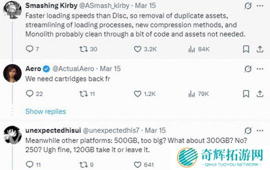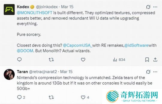 评论区有人表示:“Monolithsoft可能删除了不需要的代码和资产,简化了加载过程,并使用了新的压缩方法。”“优化和压缩显然是一门失传的艺术”“现在的游戏动辄就是100GB以上,希望他们能跟任天堂学学。”“任天堂的压缩技术是无与伦比的,《塞尔达传说:王国之泪》容量为13GB,如果在其他主机上,则很容易达到50GB以上。”