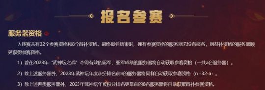那么,根据规则,如果209届武神坛的冠军和亚军还在这八大服务器之间产生,那么,今年武神坛明星赛剩下的24个名额将由年度总积分排行榜的前后顺序产生,他们分别是:齐云楼、水泊梁山、2008、阳光城、台州湾、橘子洲、恭喜发财、雨花台、钱塘江、南阳府、金戈铁马、小梅沙、普陀山、彩云之南、群星璀璨、东海崂山、东岳泰山、绍兴鉴湖、苏堤春晓、雄鹰岭、花果山、绍兴兰亭、避暑山庄、黄鹤楼。