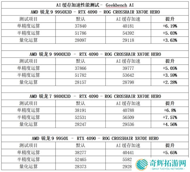 为了验证这一技术的普遍适用性,测试团队还使用了RTX 4090显卡进行了跨代验证。结果显示,在锐龙7 9800X3D平台上,AI缓存加速引擎仍能带来最高7.57%的性能增幅。在UL Procyon AI计算机视觉基准测试中,AMD锐龙7 9800X3D的表现尤为出色,实现了12.75%的性能提升。