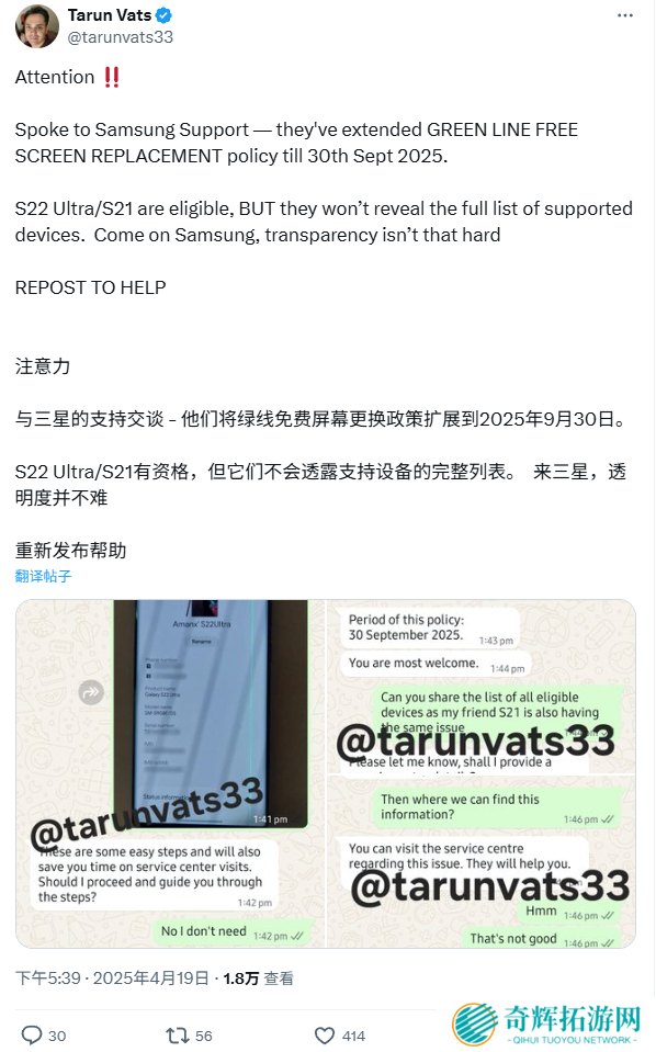 该服务适用于 Galaxy S21 全系、Galaxy S21 FE、Galaxy S22 Ultra,当地用户如果遇到类似的显示问题即可申请免费换屏。不过,虽然面板材料费全免,但用户仍需承担人工费(本站注:具体金额未披露)。