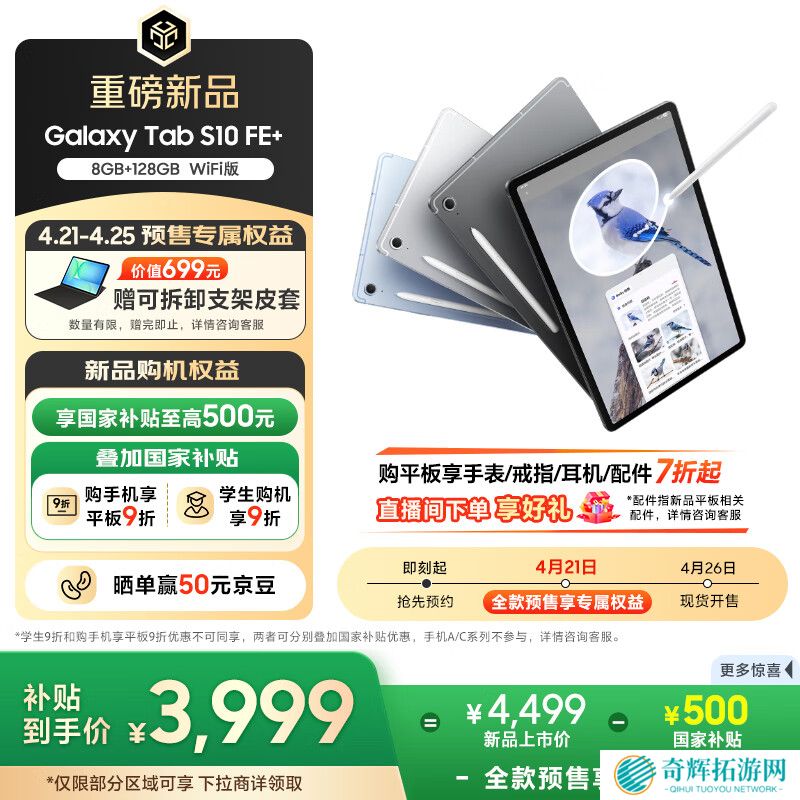 本站 4 月 18 日消息,三星 Galaxy Tab S10 FE 系列平板国行版将于 4 月 21 日开售,该产品搭载 Exynos 1580 芯片,售价 3499 元起,国补价 2999 元起。
