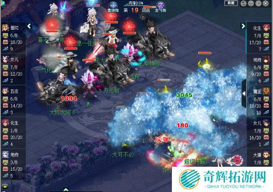 20回合,珍宝阁发起进攻,四扫琴音击倒紫禁城的盘丝,随后拉出多只谛听清宠,为之后的进攻做准备,可惜被紫禁城的高速壁垒和隐攻防下,但是也清掉了紫禁城不少宝宝。28回合,珍宝阁再次发起点杀,击倒紫禁城五庄。紫禁城只得立起三个纸人做防御姿态。