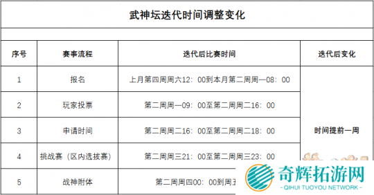 武神坛迭代后,之前的比赛流程全部提前一周。报名从上个月第四周周六就开始,玩家投票、区内选拔赛申请,选拔赛开打和战神附体都相应提前。