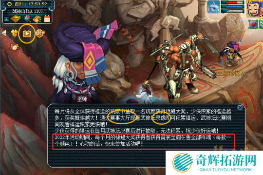武神坛新增“观战锦鲤”玩法:通过观战可以积累“福运”,武神坛决赛后会抽取1名幸运玩家获得锦鲤大奖。值得注意的是,在2022年活动期间,锦鲤大奖获得者可以获得霓裳宝阁在售全部祥瑞(每款1个颜色)。