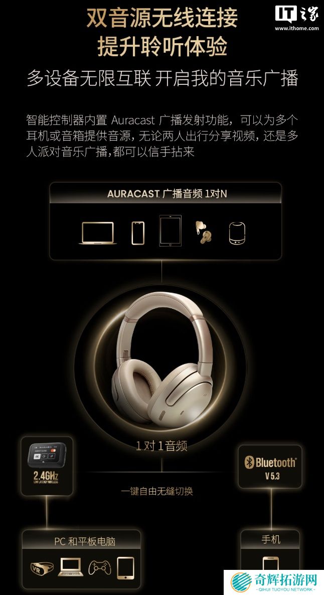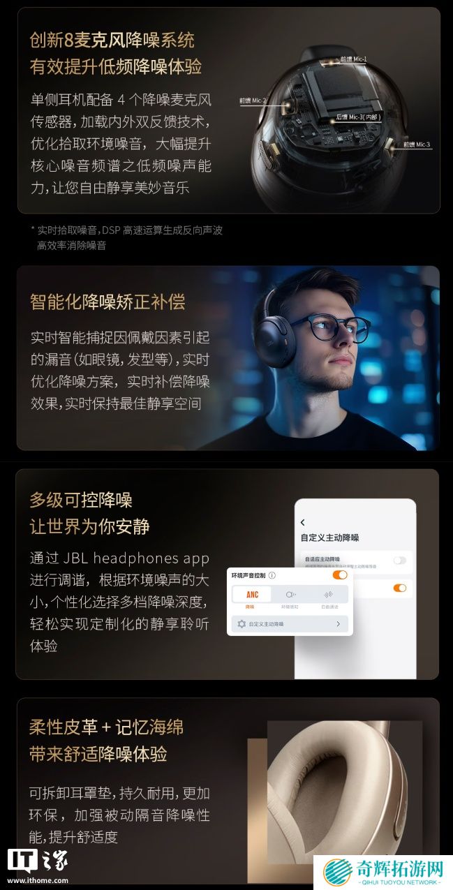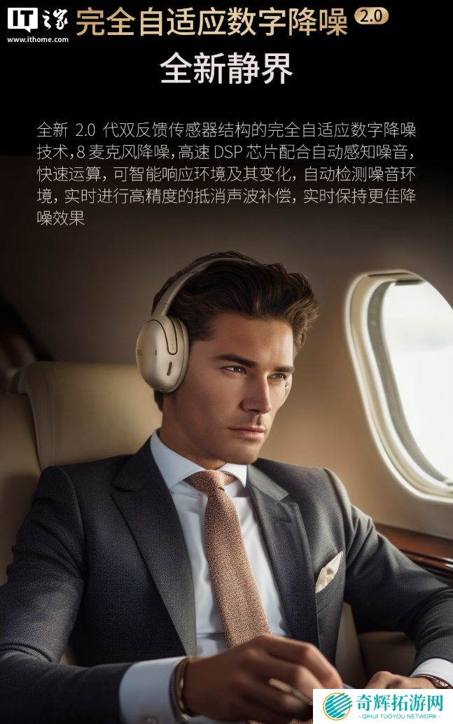 耳机配备柔性皮革 + 记忆海绵,支持完全自适应数字降噪 2.0,单侧耳机配备 4 个降噪麦克风传感器,加载内外双反馈技术,可优化拾取环境噪音。耳机还支持智能化降噪矫正补偿、环境声音控制。