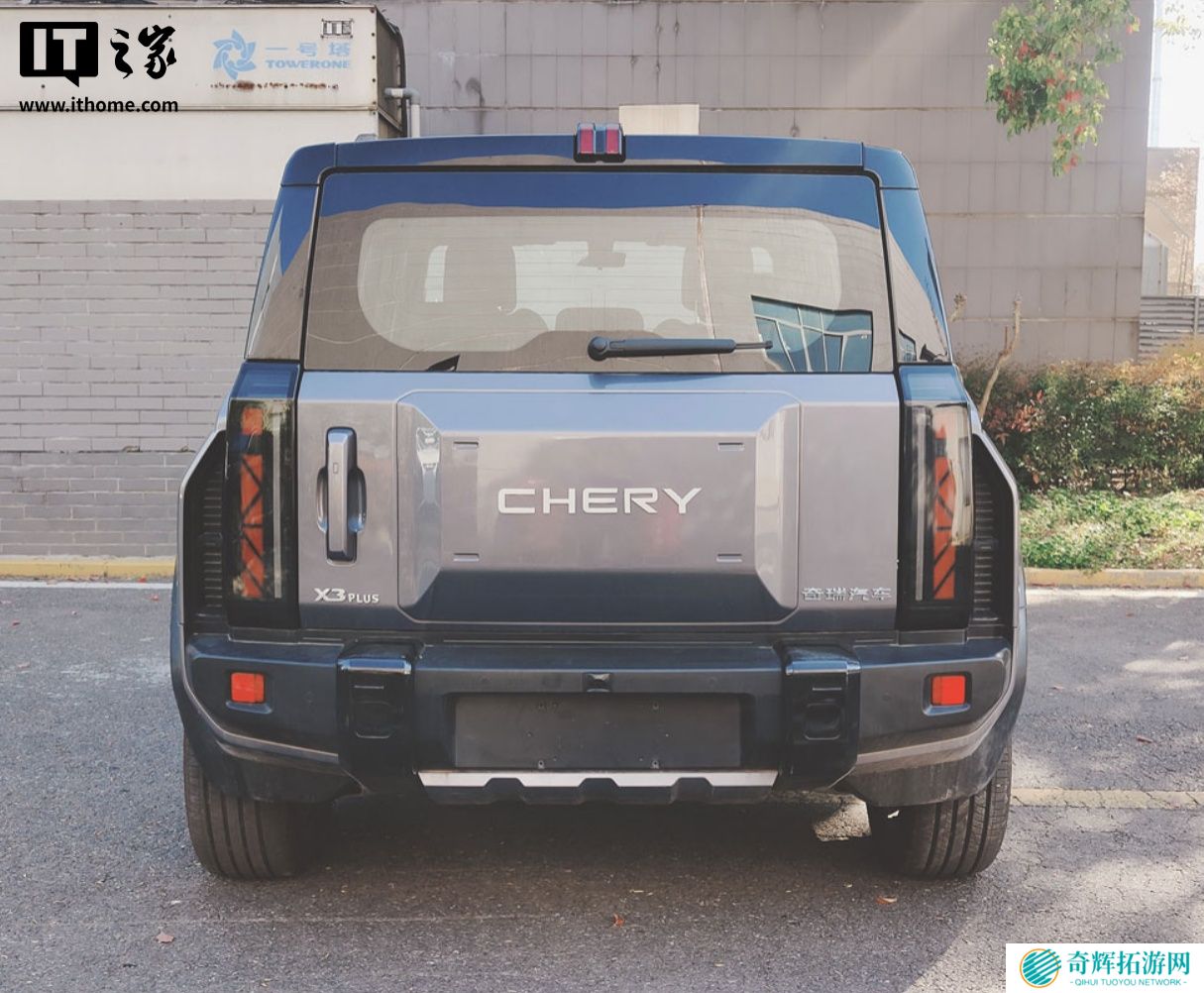 从图中可以看到,该车采用黑化外观、方盒子造型,尾部有大大的 CHERY 英文标志。