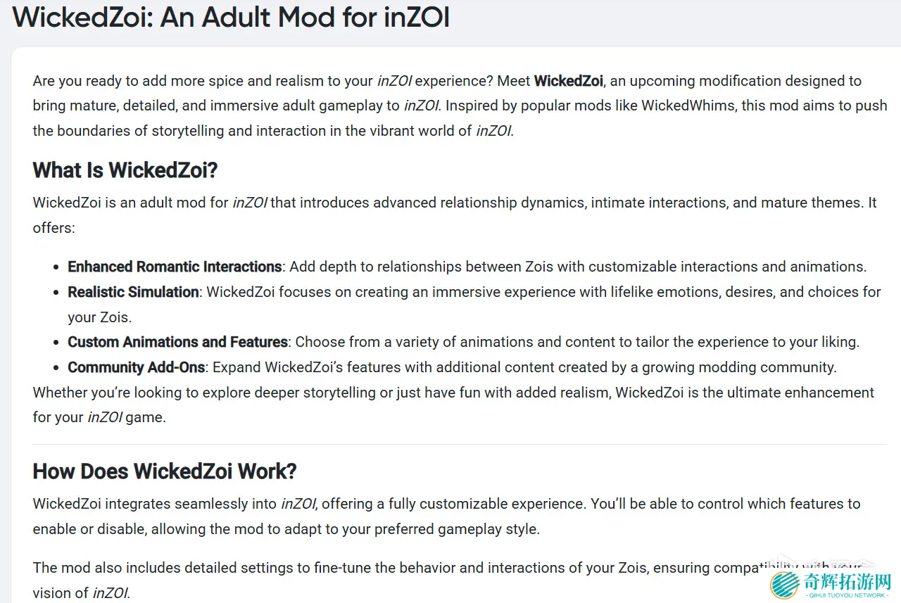 1、WickedZoi是专为inZOI打造的热门模组,加入了更多细腻的关系动态、亲密互动以及成熟主题,带来更加沉浸式的游戏体验。