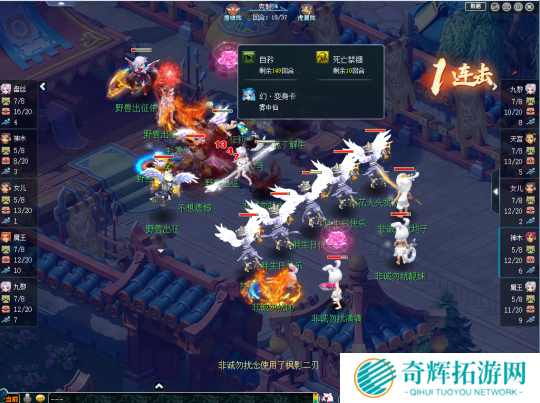 比赛第20回合时,【野兽出征】全体人物单位已经处于倒地状态,只能靠高隐龟速净台宠苦苦支撑。不过,韧性十足的他们并没有因此放弃,而是利用女儿村的一速优势使用慈航普渡,将劣势拉回一点。