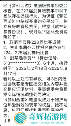 齐云楼本届武神坛携带3000W战神出战,但是却在淘汰赛16进8中违规,取消223届武神坛成绩,同时禁止参加224、225届武神坛比赛,官方此举无疑是为武神坛的公平公正保驾护航,与歪风邪气斗争到底,值得点赞!
